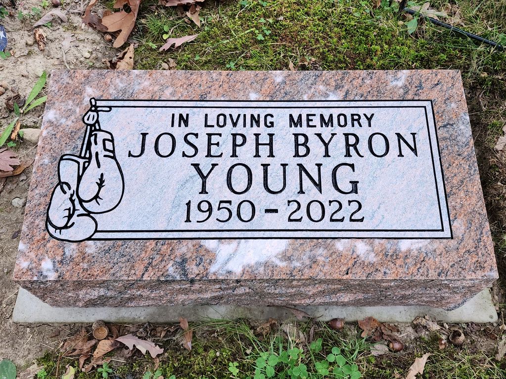 Carvings of boxing gloves, and a double line border with v-cut lettering