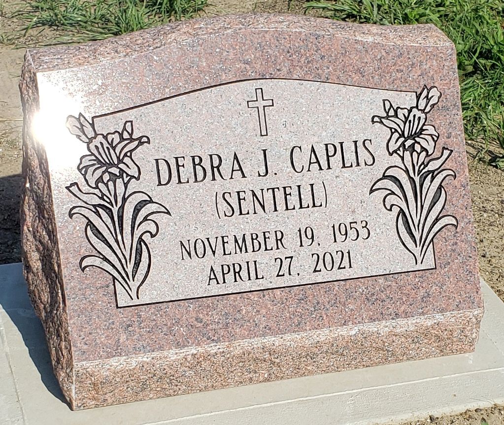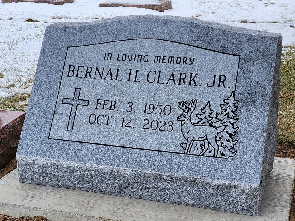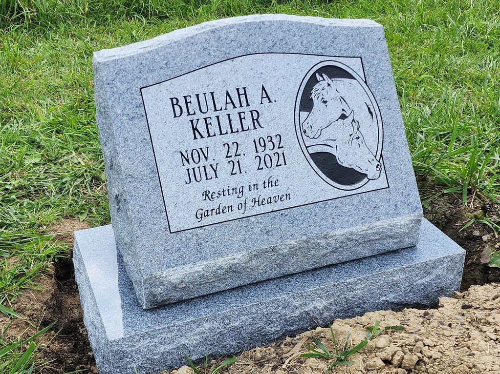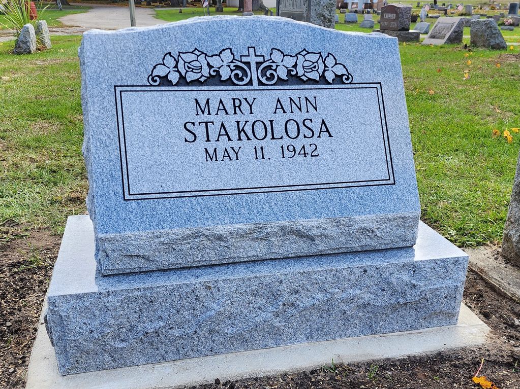 Slant markers stand upright and the cut of the headstone's face is slanted. A slant marker can sit on the cement foundation or have a granite base added. Take a look at some of the slant markers that we have completed. Please call for pricing.